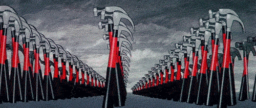 อีกอนิเมชั่นหนึ่งที่ถือว่าตราตรึงไม่น้อย ขบวนพาเรดค้อน ซึ่งคือสัญลักษณ์ของการทำลายล้าง (กำแพง) ความต้องการแท้จริงของ Pink ถ้าได้เป็นผู้นำเผด็จการ จะไม่ยินยอมให้ถูกห้อมล้อมด้วยผนังกำแพง กฎกรอบ ขนบวิถี ประเพณีสังคมอย่างเด็ดขาด