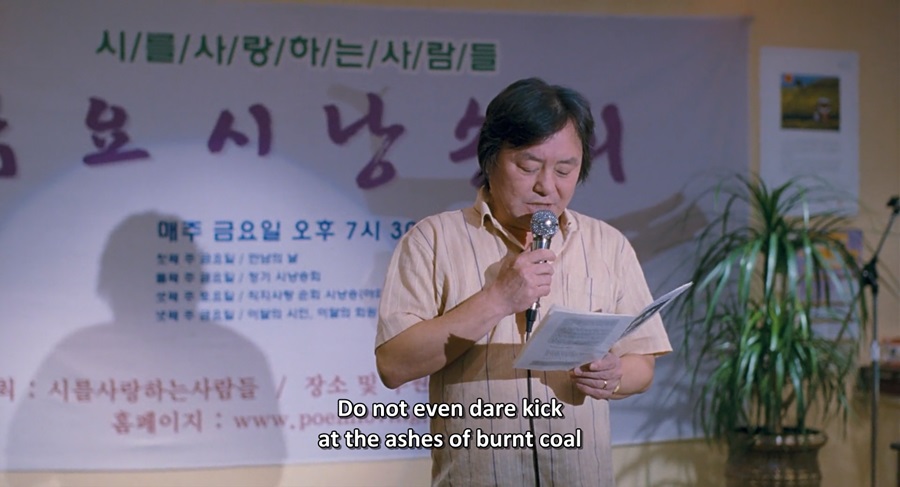 Yang Mi-ja เดินทางมารับฟังการอ่านบทกวี (Poetry Recital) สถานที่แห่งนี้เต็มไปด้วยนักกวีมืออาชีพ ประพันธ์บทกลอนที่ไม่เพียงงดงาม แต่ยังอธิบายเบื้องหลัง ที่มาที่ไป แรงบันดาลใจ เพื่อให้ผู้ฟังพบเห็นความงดงาม เข้าใจนัยยะความหมายอย่างลึกซึ้ง