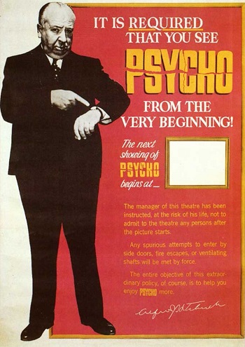 สมัยก่อนโรงภาพยนตร์มีไม่เยอะ รอบหนังมีน้อย คนที่ไปถึงโรงหนัง อยากดูเรื่องไหนก็ดู บางเรื่องฉายไปเกินครึ่งเรื่องแล้วก็เข้าไปดูได้, Psycho (1960) เป็นหนังเรื่องแรกในสมัยนั้น ที่ Hitchcock พยายามสร้างค่านิยมว่า ‘ถ้าคุณจะดูหนังเรื่องนี้ ต้องเข้าโรงหนังให้ตรงเวลาฉาย และเริ่มดูจากต้นเรื่องเท่านั้น ถึงจะได้อรรถรสอย่างเต็มอิ่ม’, ถึงขนาดไปต่อรองกับผู้จัดการโรงหนัง ว่าต้องไม่อนุญาติให้ใครเข้าชมหนังตอนกลางเรื่อง ใช้กำลังเข้าห้ามได้เลย