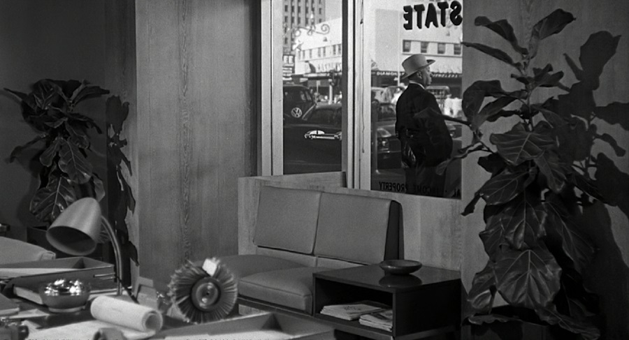 ผกก. Hitchcock สวมหมวกคาวบอยสีขาว Stetson ยืนอยู่ด้านนอก/ตรงทางเข้าบริษัทอสังหาริมทรัพย์ที่ Marion ทำงานอยู่ เหตุผลที่รีบปรากฎตัว เพื่อผู้ชมจะไม่ต้องเสียเวลาจับจ้องมองหา ให้ความสนใจกับเรื่องราวของหนังมากกว่า