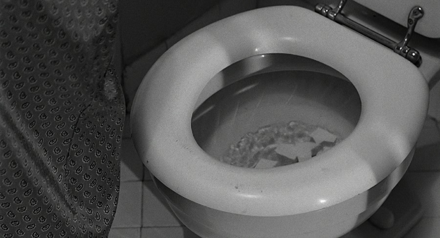 กับฉากที่ผมชอบที่สุด นี่เป็นขณะที่ Norman หลังจากถกเถียงกับแม่เพื่อเชิญ Marion ไปกินข้าวเย็นที่บ้านด้วยกัน แต่แม่ไม่อนุญาติ เขาเลยยกถาดน้ำและขนมปังมาให้, ขณะที่ทั้งสองคุยกัน ‘No…mother…my mother…what is the phrase? She isn’t quite herself today.’ เสียงพูดของ Norman ตะกุกตะกัก ถ้าสังเกตให้ดีเราจะเห็นภาพใบหน้าของเขาสะท้อนกับกระจกจางๆ นี่แสดงถึง การมี 2 ตัวตนในคนๆเดียว, ฉากลักษณะนี้มีเยอะมากในหนังนะครับ กระจกที่สะท้อนตัวตนของตัวละคร แต่ที่ผมชื่นชอบช็อตนี้ที่สุด เพราะ คำพูด mother ที่ซ้ำ 2 รอบ มันสื่อถึง Marion ได้ด้วย, กับมุมมองการดำเนินเรื่อง ที่ครึ่งแรกเป็น Marion ครึ่งหลังเป็น Norman นี่แสดงถึง 2 เรื่องราว 2 ตัวละครหลักในหนัง 1 เรื่อง ซึ่งก็คือ 2 ตัวตนใน Norman ครึ่งหนึ่งคือแม่ อีกครึ่งหนึ่งคือเขา มีคนหนึ่งต้องตาย เช่นกันกับในจิตใจของ Norman ที่ตอนจบเหลือเพียงคนเดียว