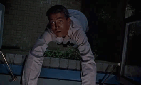 เราต้องเข้าใจข้อจำกัดยุคสมัย ทศวรรษนั้นยังไม่นิยมใช้สตั๊นแมน หรือเทคโนโลยีที่ช่วยให้ฉากเสี่ยงอันตรายออกมาดูสมจริง วิธีการก็คือให้ Stewart กระโดดลงมาจริงๆ แต่ก็ไม่ได้สูงมาก (เมื่อเทียบกับสตั๊นแมนใน Vertigo) มีเบาะรองข้างล่าง นำฟุตเทจมาตัดแปะ ซ้อนภาพ พอจะถึงพื้นก็สลับเปลี่ยนมุมกล้อง ได้แค่นี้ก็สร้างความตกอกตกใจให้ผู้ชมสมัยนั้น แทบใจหายใจคว่ำ