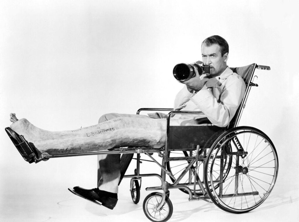 ด้วยความที่เรื่องราวหนัง นำเสนอผ่านมุมมองตัวละคร L.B. “Jeff” Jefferies ประสบอุบัติเหตุ ขาหักเข้าเฝือก นั่งๆนอนๆ ไม่สามารถขยับเคลื่อนย้ายไปไหน งานภาพจึงเวียนวนอยู่ในรัศมีอพาร์ทเม้นท์ ภายในห้องพัก ไม่ก็เหม่อมองออกนอกหน้าต่าง