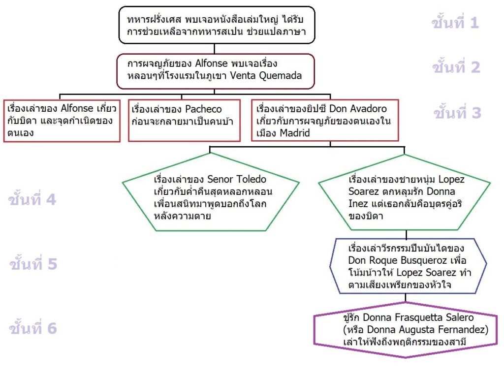 - เรื่องเล่าของ Lopez Soarez (และ Don Roque Busqueros) คือในกรณีที่ Alfonse เดินทางมาถึงกรุง Madrid คงจะได้พบเจอหญิงสาว ตกหลุมรัก แต่งงาน