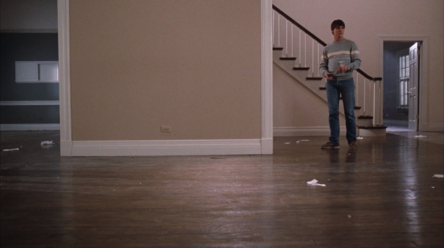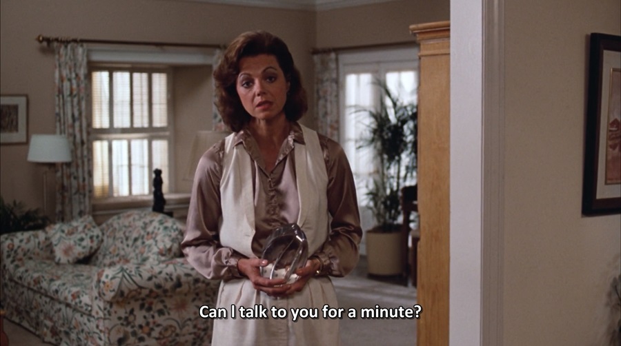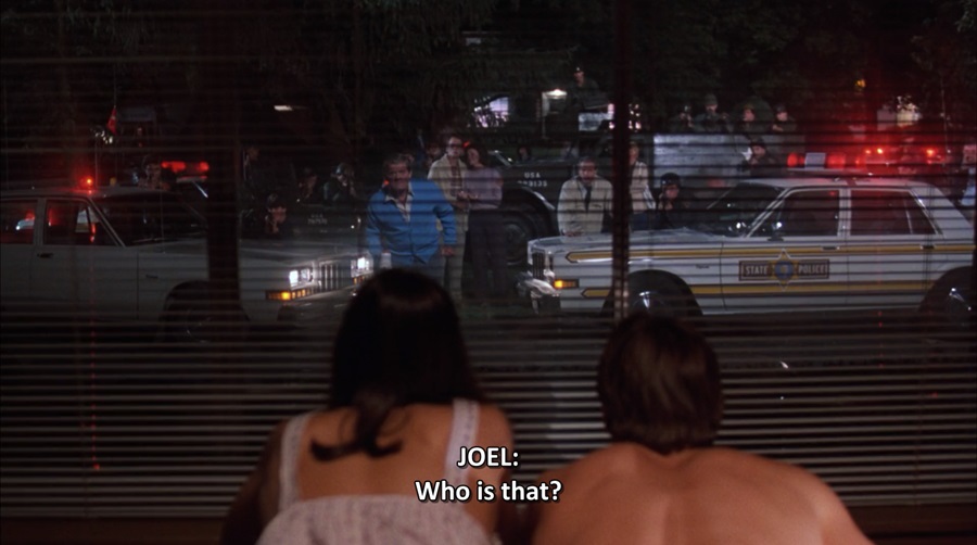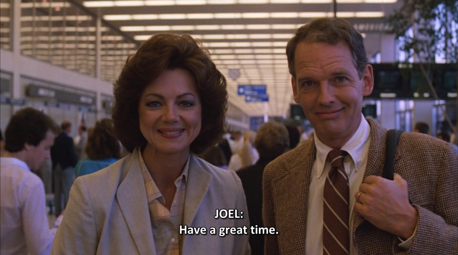 ตลอดซีเควนซ์ที่บิดา-มารดา ตระเตรียมตัว กำลังจะออกเดินทางไปท่องเที่ยวพักผ่อน ถ่ายทำด้วยมุมมองบุคคลที่หนึ่ง (First-Person) ผ่านสายตา Joel ทั้งสองมักหันมาสบตาหน้ากล้อง “Breaking the Fourth Wall” จับจ้องมองผู้ชม สร้างความอึดอัด กระอักกระอ่วน พยายามพูดบอก ออกคำสั่งโน่นนี่นั่น มีความเรื่องมาก เจ้ากี้เจ้าการ นี่คือลักษณะของ ‘Over-Protection’ เลี้ยงดูแลบุตรราวกับไข่ในหิน … ภาพสะท้อนผู้ใหญ่ตั้งแต่ยุคสมัย Ronald Reagan ได้เป็นอย่างดี