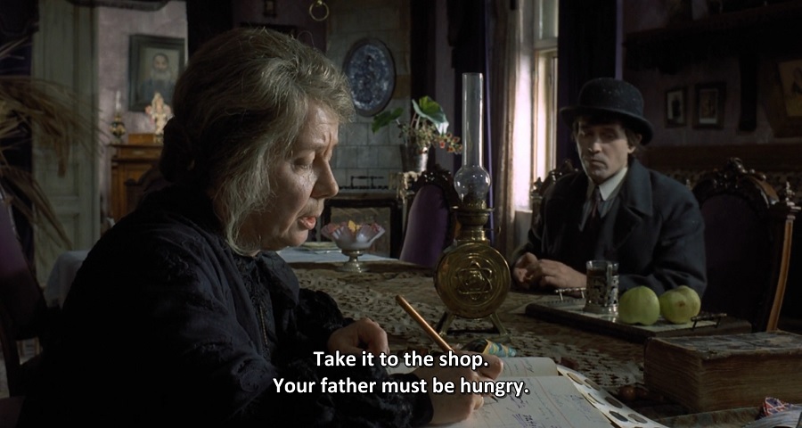 ตรงกันข้ามกับตอนครึ่งแรกที่ Józef พยายามออกค้นหา ติดตามรอยเท้าบิดาด้วยความต้องการของตนเอง, ครานี้มารดาเป็นผู้ร้องขอ ออกคำสั่งให้นำอาหารและเครื่องดื่มไปส่งมอบยังห้องใต้หลังคา ถึงอย่างนั้นเขากลับแสดงอาการแข็งข้อต่อต้าน ด้วยการเดินลงบันไดชั้นล่าง แล้วบังเอิญพบเจอบิดากำลังครึกครื้นกับความวุ่นวายหน้าร้านขายผ้า