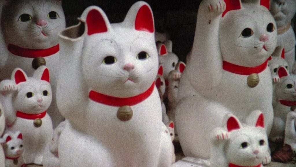 ผกก. Marker คือทาสแมวอันหนึ่งแห่งวงการภาพยนตร์ จริงๆตั้งแต่ The Koumiko Mystery (1965) ก็มีการฉายภาพแมวกวัก (招き猫 อ่านว่า Maneki Neko) แต่คราวนี้คงเพิ่งพบเจอวัดแมว (Gotokuji Temple) ในกรุง Tokyo และเล่าปรัมปราเจ้าเหมียว Tora (จริงๆแล้ว Tora, 虎 แปลว่าเสือ แต่ก็มองเป็นแมวใหญ่ได้กระมัง) หนีออกจากบ้าน ไม่เคยหวนกลับมา เลยสร้างวัดเอาไว้ให้เคารพบูชา