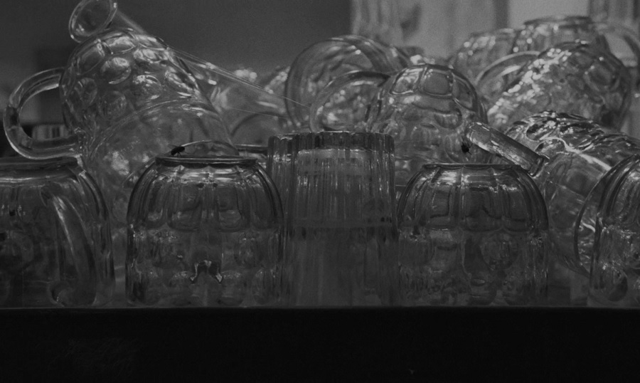 เริ่มจากระยะภาพ Close-Up ใบหน้านิ่วคิ้วขมวดของเจ้าของบาร์ Spider จากนั้นค่อยๆเคลื่อนถอยหลัง โดยสมาชิก(ในบาร์)คนอื่นๆต่างหยุด(เวลา)อยู่นิ่งชั่วขณะหนึ่ง (อิทธิพลจากผู้กำกับ Fassbinder) พอเลื่อนจนมาหลังชนประตูทางเข้า (สังเกตว่าระดับความสูงของภาพจะลดต่ำลงด้วยละ) ค่อยตัดไปด้านหลังร้าน พบเห็นหยิบไม้กวาดขึ้นมาทุบทำลายสิ่งข้าวของ พร้อมตะโกนด่าพ่อล่อแม่ … และเมื่อสงบสติอารมณ์ก็หยิบไม้กวาดขึ้นมาเก็บกวาดเศษซากที่ตนเองทำไว้