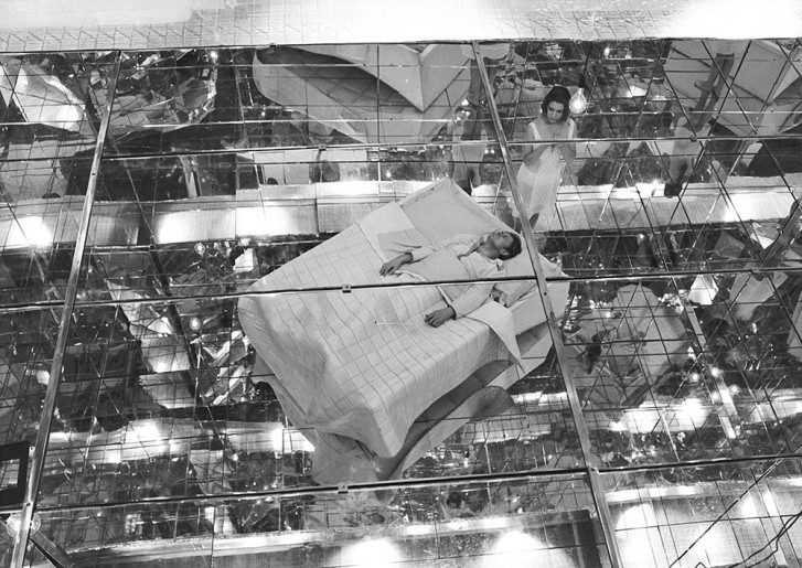 เห็นเบื้องหลังฉากนี้เลยนำมาให้ชมดีกว่า, ถือได้ว่าสะท้อนฉากอนาคตอันไกลโพ้นของ 2001: A Space Odyssey (1968) ตรงกันข้ามกับห้องสีขาวโพลนว่างเปล่า กระจกสะท้อนตัวตน จิตวิญญาณ และความเป็นไปได้ไม่มีที่สุด