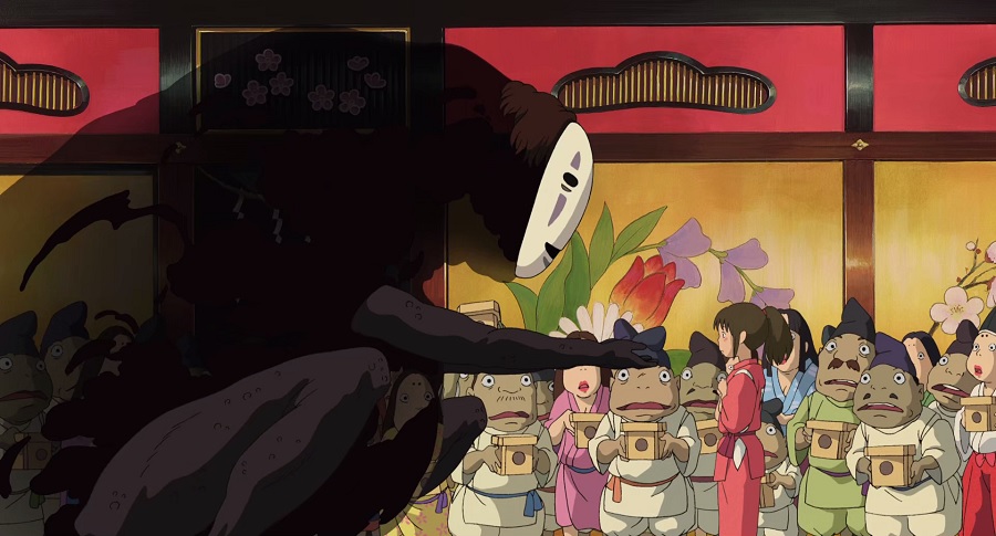– ขณะที่ Kaonashi มาด้วยคำสรรเสริญเยินยอ เสกทองขึ้นมาแจกจ่ายจนผู้คนคลั่งไคล้ แต่ไม่นานสันดานความชั่วร้ายเริ่มออก เมื่อล้วงคอนำทุกสิ่งอย่างออกมา ก็แทบไม่หลงเหลืออะไรมีค่าให้น่านับถือ ซ้ำร้าย Chihiro ยังถูกตราหน้าว่าเป็นผู้ก่อให้เกิดปัญหา
