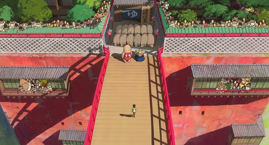 ไฮไลท์ของช็อตนี้คือการจัดวางองค์ประกอบ Chihiro เดินข้ามสะพานมาเลือก สองคนที่ขัดขวางคือ เด็กและคนแก่ ขณะที่บริเวณรอบข้างมีกองเชียร์ล้นหลาม (ทุกคนล้วนเป็นหมูในคอก ผู้พ่ายแพ้ต่อการเลือกทั้งนั้น)