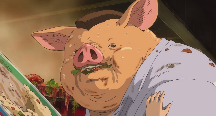 พ่อ-แม่ ของ Chihiro ด้วยความละโมบโลภ เมื่อมาถึงสถานที่ไม่รู้ด้วยซ้ำว่าแห่งหนไหน ก็ทำการบริโภคกอบโกย ตะกละตะกลามก่อนเลยไร้สามัญสำนึก นี่สะท้อนถึงค่านิยมของมนุษย์สมัยนี้-นั้น ที่กินไม่เลือกเหมือนหมู แถมไม่รู้จักพออีกต่างหาก ทำให้ค่อยๆสูญเสียจิตวิญญาณ คุณค่าความเป็น ‘มนุษย์’ สิ้นไป