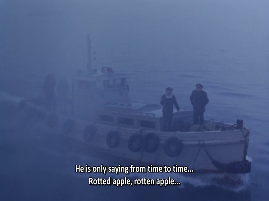 จริงๆเราสามารถตีความได้ทั้ง Spyros ทำการเนรเทศตนเอง หรือความขัดแย้งกับทางการที่ไม่ยอมขายบ้าน จึงกำลังถูกส่งกลับประเทศ แต่ทว่าไม่มีเรือลำไหนยินยอมรับการโดยสาร เอาแต่พูดคำว่า σάπιο μήλο อ่านว่า sápio mílo แปลว่า Rotten Apple เพื่อสร้างสัมผัสทางกลิ่นที่ไม่พึงประสงค์ ปฏิเสธอยู่เคียงชิดใกล้ ต้องการตีตนออกห่างไกลโดยไว