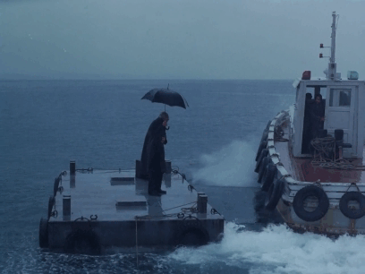 พอเรือตำรวจปล่อยทิ้ง Spyros ไว้บนแท่นลอยน้ำ (Floating Platforms) ล่องลอยคออยู่กลางมหาสมุทร ก็มีการเร่งเครื่อง สะบัดตูด ขับวนรอบ 360 องศา ราวกับไม่ยี่หร่า ไม่สนห่าเหว ปัดความรับผิดชอบ ไร้มนุษยธรรม … แต่เพราะนี่คือหนังของผกก. Angelopoulos เราจึงต้องขบครุ่นคิด ตีความในเชิงสัญลักษณ์ ซึ่งผมมองว่าเป็นความจงใจล้อเลียน หนังซ้อนหนัง ฝนตกอย่างเว่อวังอลังการ ทำออกมาให้ดูตลกขบขันเสียด้วยซ้ำ