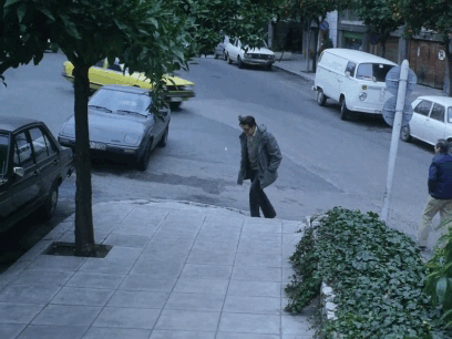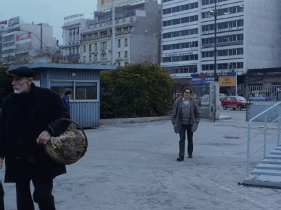 ราวกับ déjà-vu ภาพแรกคือตอน Alexandros ออกติดตามชายสูงวัยขายดอกไม้, ภาพหลังเขาติดตามบิดา Spyros หนีออกจากบ้าน มองหาสถานที่อยู่ใหม่ โรงแรมเคยพักอาศัย สังเกตว่ามันสี่แยกเดียวกัน มุมกล้องเหมือนเดิมเป๊ะๆ ยกเว้นสภาพอากาศฟ้าครึ้ม vs. ฝนตกถนนเปียก (ตอนยังไม่พบเจอบิดา ถือเป็นช่วงเวลาแห่งความหวัง วาดฝัน แต่ความจริงกลับไม่เป็นเช่นนั้น)