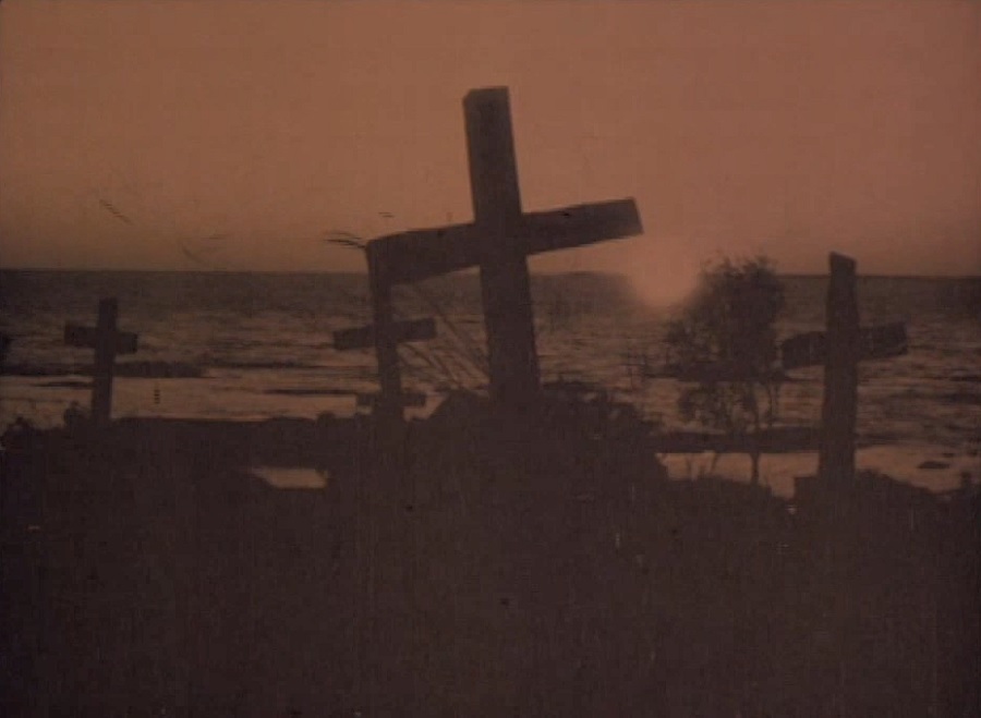 นี่คือบทกวีพรรณาความตายของ Terje Vigen ไม้กางเขน ดอกไม้ สายลม และดวงอาทิตย์กำลังลาลับขอบฟ้า