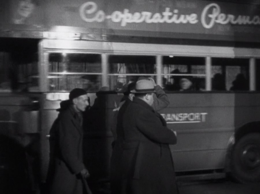 ผมพยายามจับจ้องมองหาว่าผกก. Hitchcock แอบซ่อนอยู่แห่งหนไหน แต่หันหลังให้แบบนี้ใครไปจะรับรู้ได้?? นี่เป็นฉากภายนอก London Music Hall หลังได้ยินเสียงปืน เกิดความโกลาหล ผู้คนรีบอพยพหนีออกมาภายนอก พอดิบดีรถโดยสารสองชั้นเคลื่อนผ่าน ชายร่างอวบอวนกำลังเดินข้าม และเขวี้ยงขว้างขยะลงพื้น