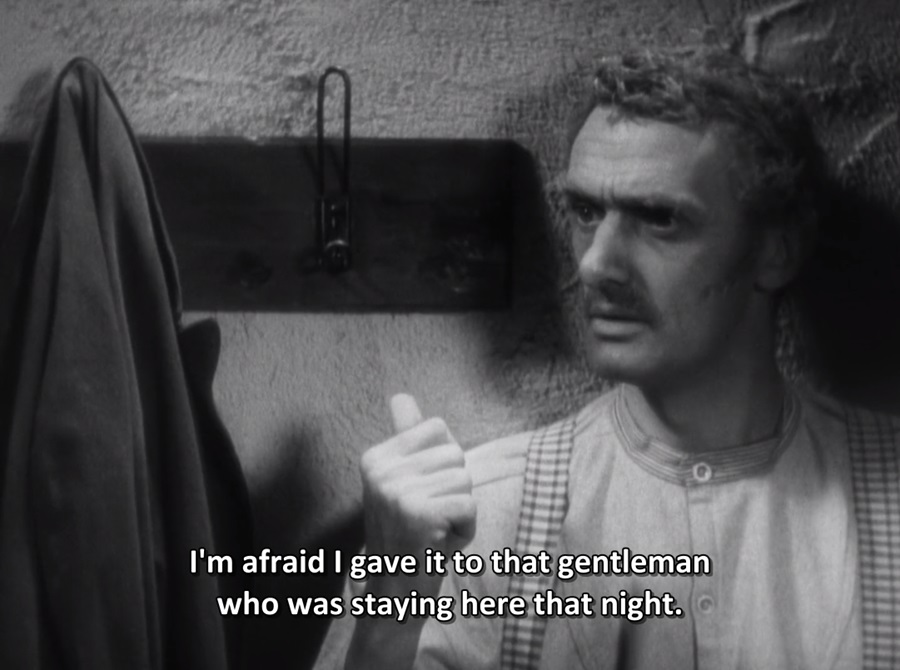 ผมว่ามันเป็นเรื่องตลกที่ไม่ตลกสักเท่าไหร่ แต่สอดคล้องกับทิศทางหนัง “The Wrong Man” ในตอนแรก Hannay พยายามพูดเล่าความจริงเกี่ยวกับสายลับ ฆาตกรรม แต่คนส่งนมกลับมองว่าเป็นเรื่องไร้สาระ แต่พอเขาเล่าเรื่องหลอกๆ(แต่อ้างว่าจริง)เกี่ยวกับหญิงสาว คบชู้นอกใจ (อะไรสักอย่างนี่แหละ) กลับหลงเชื่อสนิทใจ ยินยอมมอบชุดคลุมปลอมตัว สลับขาวเป็นดำ ดำเป็นขาว … โลกใบนี้กำลังพลิกตารปัตร!