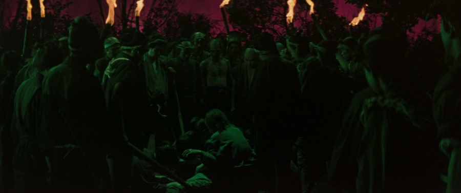 การรุมประชาทัณฑ์จับโจร สังเกตว่าพื้นหลังลิบๆสาดสีแดงเลือด ชาวบ้านทุกคนต่างอาบด้วยแสงสีเขียวราวกับปีศาจร้าย ซึ่งสิ่งที่พวกเขากำลังจะตัดสินลงโทษ แน่นอนว่าไม่ใช่สิ่งที่สังคมสมัยนี้ยินยอมรับได้สักเท่าไหร่