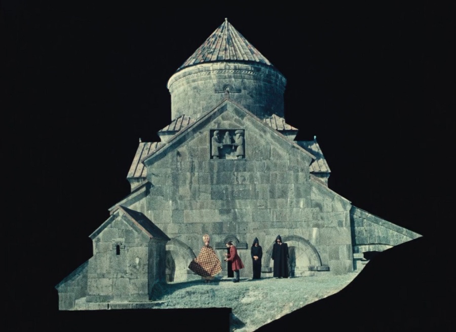 ถ้าเป็นหนังเรื่องอื่นๆ คงใช้การเคลื่อนเลื่อนขึ้น Tilt Up หรือ Zoom In แต่เพราะต้องทำให้สอดคล้องภาษาภาพยนตร์ ผกก. Parajanov เลยทำได้แค่แช่ค้างภาพ ตัดต่อร่นระยะทาง จิตวิญญาณล่องลอยออกจากร่าง (ผีเสื้อลอกคราบ) โบยบินสู่สรวงสวรรค์ พอถ่ายถึงเพดานวิหาร ตัดไปภาพสุดท้ายหันข้าง Angel of Resurrection ราวกับได้ถือกำเนิด เกิดใหม่ ในภพภูมิถัดไป (ตามความเชื่อชาวคริสต์ก็คือกลายเป็นนางฟ้า/เทพธิดา เทวทูตบนสรวงสวรรค์)