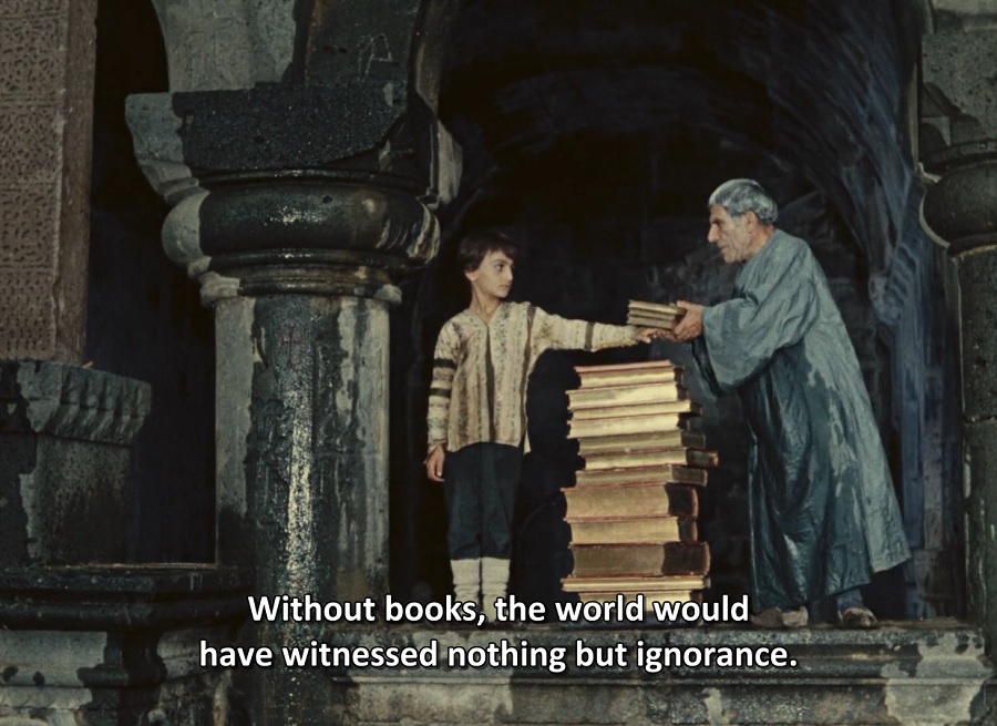 หนังสือคือสิ่งที่ Sayat-Nova ได้รับการปลูกฝัง ตระหนักถึงความสำคัญ จุดเริ่มต้นทำให้เขาหลงใหลการอ่าน-เขียน กลายเป็นส่วนหนึ่งของชีวิตมาตั้งแต่เด็ก! … ช่วงต้นเรื่องที่มีการแทรกภาพหนังสือคั่นแบ่งระหว่างภาพเชิงสัญลักษณ์ ก็เพื่อสื่อถึงสิ่งที่ Sayat-Nova ใช้ระบายความอึดอัดอั้น ด้วยการแต่งเพลง ประพันธ์บทกวี รำพันความทุกข์ทรมานที่อยู่ภายในจิตใจออกมา
