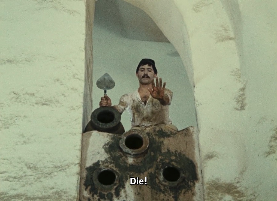 Paradjanov has described the film as a series of Persian miniatures. The camera remains fixed in place, as in early cinema, while the director’s mise en scène resembles a tableau-vivant, a mixture of theatre and painting. Rather than zooming or changing focal lengths, people and animals move closer and farther away from the camera, objects relating to each other in a two-dimensional manner.