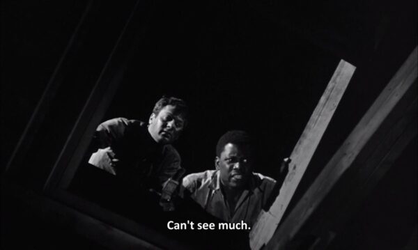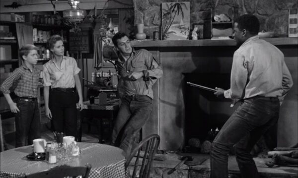 แน่นอนว่า Noah สังเกตเห็นพฤติกรรมของเธอ เปลือกภายนอกอาจไม่ได้ดูหวาดกลัวชายผิวสี แต่ทว่าถ้อยคำพูด กิริยาท่าทาง “Him too?” ชัดเจนว่ามีอคติต่อคนดำ (เธอคือ Stereotype ของชาวอเมริกัน!) ด้วยเหตุนี้เมื่อเขาสามารถปลดเปลื้องพันธนาการ หลุดจากโซ่ตรวน จึงรีบหยิบปืนขึ้นมาข่มขู่ บีบบังคับให้ทำโน่นนี่นั่น จนกระทั่งผลอยหลับจึงถูกแก่งแย่งปืนกลับคืนมาโดยพลัน!