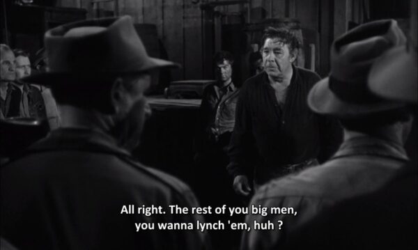 หลังจากชาวบ้านล้อมจับกุมสองนักโทษหลบหนี ต่างพยายามทำตัวเป็นศาลเตี้ย ต้องการตัดสินโทษประหารชีวิต แขวนคออาชญากรทั้งสอง โดยไม่สนสีผิว ชาติพันธุ์ แต่ทว่ามีชายคนหนึ่งชื่อ Big Sam (ล้อกับ Uncle Sam รับบทโดย Lon Chaney Jr.) ลุกขึ้นมาท้าทายให้ใครสักคนลงมือ … นี่ชวนให้นึกถึงคำสอน Jesus Christ ณ Mount of Olives.