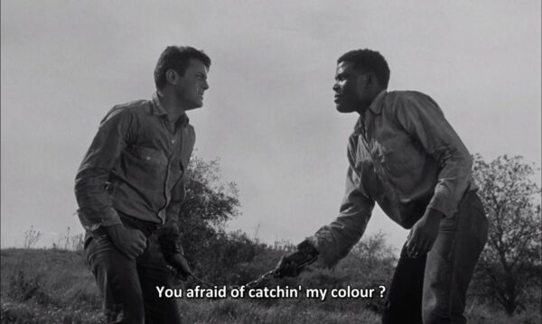 The Defiant Ones (1958) น่าจะเป็นภาพยนตร์เรื่องแรกๆที่นำเสนอการร่วมแรงรวมใจ (Integration) ระหว่างคนขาว-ชายผิวสี เพื่อหลบหนีเอาตัวรอด จำต้องพึ่งพาอาศัย ช่วยเหลือกันและกัน แต่ยุคสมัยนั้นยังมีกฎหมายแบ่งแยกสองชาติพันธุ์ สังคมจึงไม่ให้การยอมรับ เกิดประเด็นโต้เถียงขัดแย้ง (Controversy Films) แต่ที่น่าอึ่งทึ่งคือไม่มีข้อมูลว่าหนังถูกแบนห้ามฉายในรัฐตอนใต้ (ที่ขึ้นชื่อเรื่อง Racism)