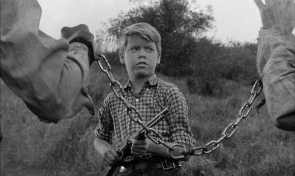 การต่อสู้สิ้นสุดลงเมื่อ Billy ถือปืนขึ้นมาจ่อ เด็กชายไม่รู้ประสีประชา ไม่รับรู้ว่าทั้งสองคือนักโทษหลบหนี เพียงเห็นชายแปลกหน้าสองคน เลยชักชวนมาที่บ้าน อาศัยอยู่กับมารดา น่าจะให้ความช่วยเหลือพวกเขาได้ … เด็กชายเป็นตัวแทนความบริสุทธิ์ไร้เดียงสา ยังไม่สามารถแยกแยะ รับรู้ความขัดแย้งทางชาติพันธุ์ พบเห็นทุกคนก็ชายแปลกหน้าเหมือนกัน ไม่ถือสาที่ถูกแย่งปืน ล้มลงหัวฟากพื้น