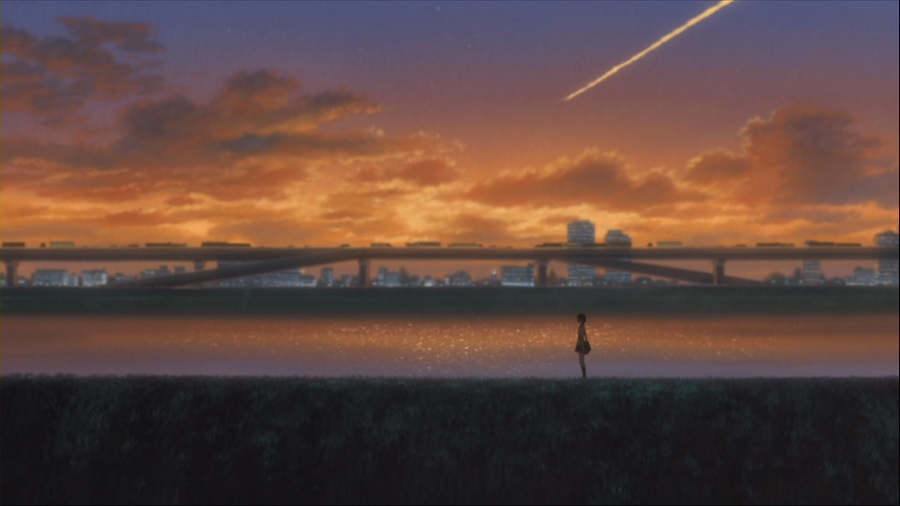 วินาทีที่ Chiaki หวนกลับสู่อนาคต ภาพช็อตนี้ท้องฟ้าสลัวด้วยก้อนเมฆ บดบังพระอาทิตย์กำลังใกล้ตกดิน ความมืดค่อยๆคืบคลานเข้ามาปกคลุมจิตใจของ Makoto และการใส่รายละเอียดอย่างไอพ่นจรวดพุ่งขี้นบนท้องฟ้า ราวกับว่านั่นคือการเดินทาง (ของ Chiaki) มันช่างมี ‘final touch’ ที่คมคายมากๆ