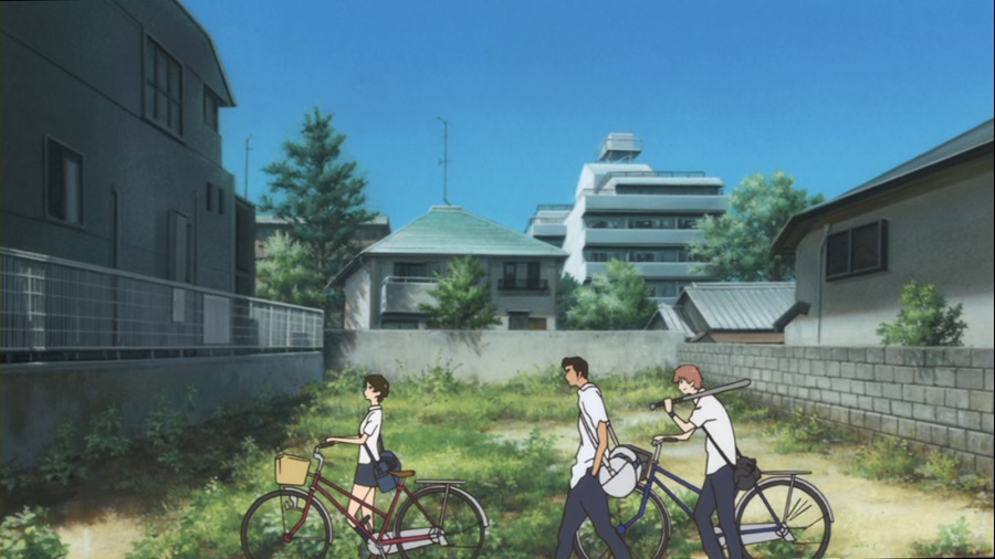 หลังจากที่ Makoto พานผ่านประสบการณ์เหนือธรรมชาตินั้น ซีนถัดมาเธอเล่าเรื่องราวดังกล่าวให้สองเพื่อนสนิท Chiaki กับ Kosuke ที่เอาแต่หัวเราะขบขัน สังเกตว่าทั้งสามเดินลากจักรยานจากขวาไปซ้าย แล้วเปลี่ยนฉากพื้นหลัง ง่ายๆแค่นั้นเอง