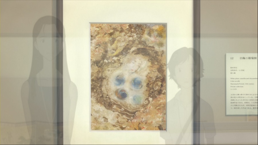 นี่คือภาพวาดที่ Chiaki ต้องการย้อนเวลากลับมาเชยชม (แต่ขณะที่เขาหยุดเวลาแล้วเดินทางมาพิพิธภัณฑ์ ภาพนี้กลับยังบูรณะไม่เสร็จซะงั้น –“) มีชื่อว่า White Plum and Two Camellias จากคำอธิบายของน้าสาว Kazuko ภาพนี้ไร้นามศิลปิน แต่สามารถรับรู้ยุคสมัยระหว่างการบูรณะ (น่าจะสังเกตจากอายุของสี และเทคนิคการวาด) ถูกรังสรรค์ขึ้นในช่วงขณะสงคราม ผู้คนอดอยาก เจ็บป่วยล้มตาย แต่ความรู้สึกที่ได้จากการมองเห็น ช่างเต็มไปด้วยอบอุ่น ผ่อนคลาย เหมือนพระแม่ธรณีโอบกอดบุตรทั้งสี่ … นัยยะของภาพนี้ ผมคิดว่าต้องการสื่อถึง Makoto พฤติกรรมแสดงออกของเธอเรียกได้ว่า อีเด็กเวรจัญไร แต่ถีงอย่างนั้นเบื้องลึกภายในกลับบริสุทธิ์ ไร้เดียงสา อ่อนเยาว์ต่อโลกยิ่งนัก