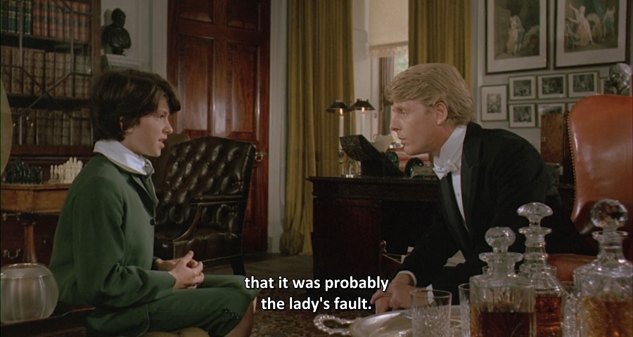ผลงานของผกก. Losey มักเต็มไปด้วยรายละเอียด ‘Mise-en-scène’ โดยเฉพาะการจัดวางตำแหน่ง ทิศทางมุมกล้อง ระยะใกล้-ไกล ขยับเคลื่อนไหวเข้า-ออก ฯ ระหว่างเด็กๆทั้งสองกำลังละเล่นต่อสู้ ตำแหน่งที่พวกเขายืนอยู่ก็มีเสาแบ่งแยก (สถานะทางสังคม) จากนั้น Leo หันไปพบเห็นพี่สาวสุดสวย Lady Marian กล้องค่อยๆซูมเข้าหา พร้อมเสียงใครคนหนึ่งที่กำลังอ่านข้อความ “napping English” ช่างสอดคล้องภาพพบเห็นเสียจริง!