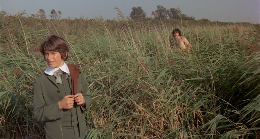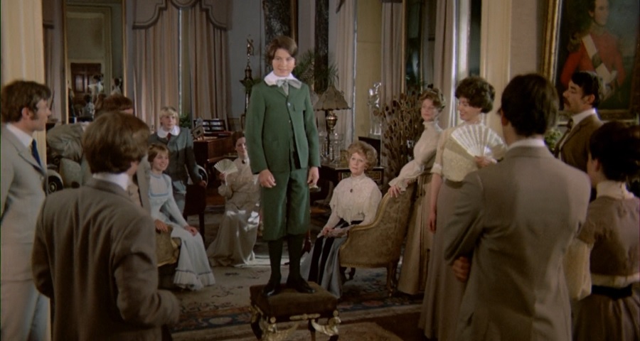 นี่เป็นช็อตที่ทำให้ผมรู้สึกหวาดสะพรึง เพราะเด็กชาย Leo ถูกห้อมล้อม จับจ้องมอง ราวกับตัวตลกที่อยู่ในความสนใจของบรรดาผู้ดีมีสกุล สวมใส่ชุดเขียว สีของชนบท ท้องทุ่งกว้าง ต้นไม้ใบหญ้า (เพราะมีแต่ Leo ที่สวมใส่ชุดเขียว จึงมีความแปลกแยกจากใครอื่น) หรือคือธรรมชาติชีวิต(ของเด็กชาย)ที่ยังเยาว์วัย สดใส ไร้เดียงสา กำลังเรียนรู้ที่จะเติบโต เข้าใจวิถีอันซับซ้อนของผู้ใหญ่