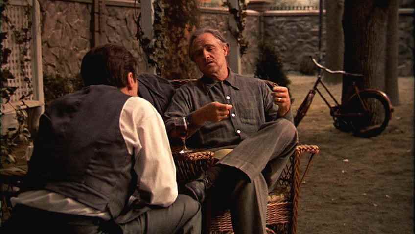 Michael คุยกับ Don Vito นี่น่าจะเป็นฉากเดียวที่พ่อลูกคู่นี้ คุยกันแบบตัวต่อตัว (ปกติจะไม่คุย เต็มที่คือมองหน้า กระซิบกระซาบ) จะเห็นว่ามีจักรยานจอดอยู่ข้างหลัง นี่แสดงถึงการเดินทาง มีสองนัยยะ