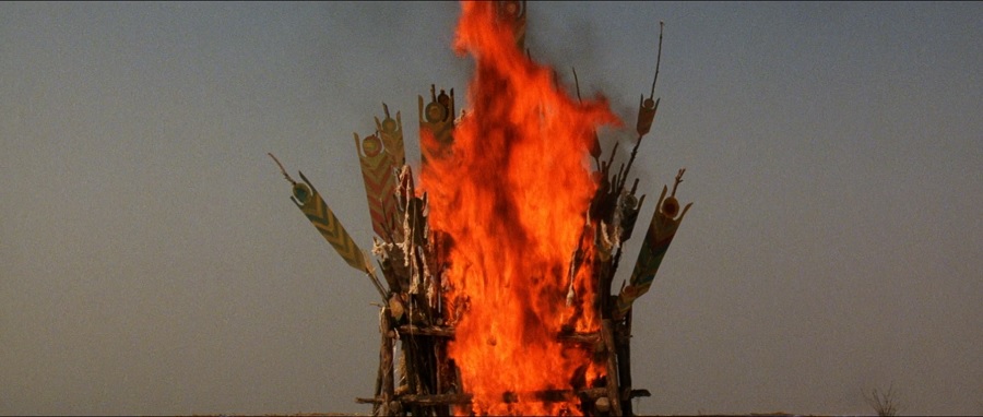 อารัมบทของหนัง เริ่มต้นด้วยการนำเสนอวิถีแห่งธรรมชาติ ก้อนเมฆเคลื่อนพานผ่าน แสงสว่าง-มืดมิด จากนั้นพบเห็นอีแร้งกากำลังเฝ้ารอคอย โบยบินลงมารุมล้อมจิกกัดมื้ออาหาร แต่พอหนังแทรกภาพพระลามะกำลังสวดมนต์ พร้อมกงล้ออธิษฐาน (Prayer Wheel) เหมือนว่าสิ่งที่พวกมันรับประทานน่าจะคือเนื้อมนุษย์ เพราะช่วงกลางเรื่องเมื่อผู้นำชนเผ่าเสียชีวิต ก็จะนำเสนอภาพเดียวกันนี้อีกครั้ง