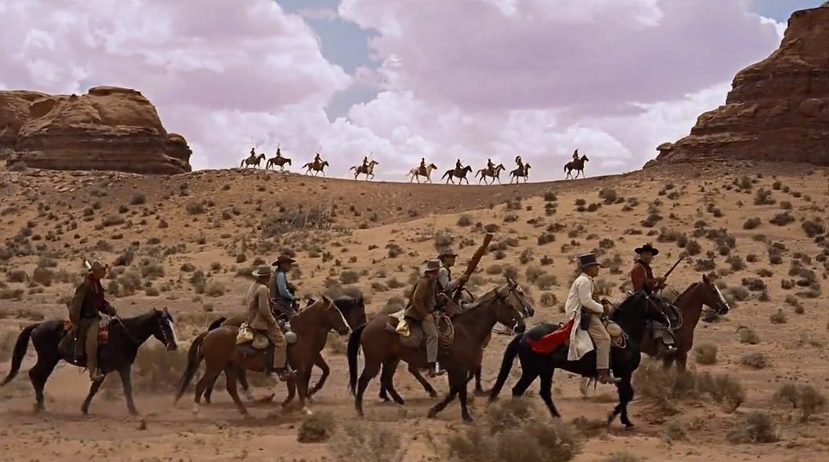 บรรดา Texas Ranger ขี่ม้าเรียงแถวตอนอยู่ใกล้หน้าจอ ขณะที่อินเดียนแดงเห็นอยู่ไกลลิบๆ จากทั้งสองฝั่งคู่ขนาน กำลังตีวงล้อมเข้ามาเพื่อต้อนให้จนมุมไร้ทางออก