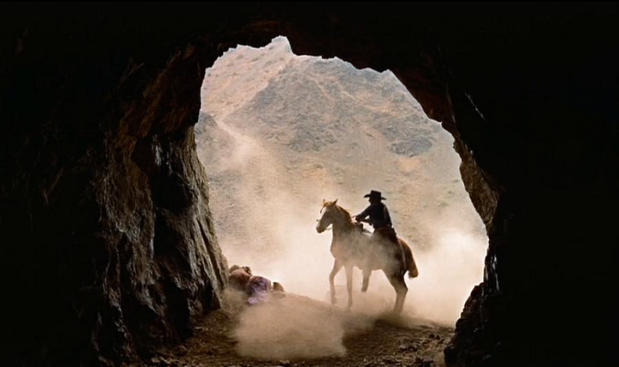 ช็อตแรกของหนังที่กลายเป็นตำนานโดยทันที ประตูบ้านเปิดออก ภายในมืดสนิท ค่อยๆเคลื่อนกล้องออกสู่แสงสว่างภายนอก เห็นไกลริบๆชายคนหนึ่งกำลังควบขี่ม้าเข้ามาใกล้, เราจะพบเห็นภาพลักษณะนี้หลายครั้งทีเดียวในหนัง ซึ่งก็จะสื่อความหมายแตกต่างออกไป เฉพาะกับช็อตนี้สามารถตีความได้ว่า คือการก้าวเดินออกมาจากความมืดสู่แสงสว่าง (จากหนังภาพขาว-ดำ ออกสู่ หนังภาพสี กว้างใหญ่ไพศาล)
