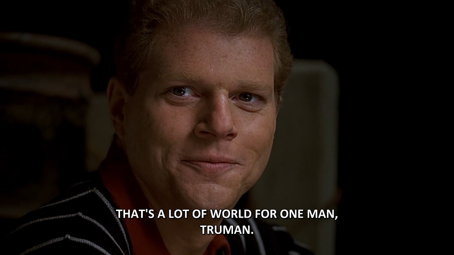 ประโยคสุดท้ายของ Truman เป็นการล้อกับคำติดปากของตนเอง (Catchphase) ทุกเช้าเมื่ออกจากบ้านทักทายผู้คนรอบข้าง “In case I don’t see you, Good Afternoon, Good Evening, and Good Night.” เรียกได้ว่าสูงสุดกลับสู่สามัญ คำทักทายและร่ำจากลาในคราเดียวกัน