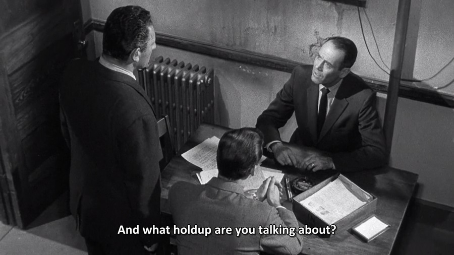เมื่อตอนที่ Manny เดินทางมายังบริษัทประกัน ลองสังเกตลีลาการนำเสนอ เอาแค่ขณะเข้ามาติดต่อขอกู้เงิน กล้องถ่ายผ่านซี่กรง สายตาพนักงานสาวจับจ้องมองขณะล้วงกระเป๋า หยิบเอกสารด้วยความหวาดระแวง วิตกจริต มันช่างมีความผิดปกติ ลับลมคมใน … ผมมองไม่เห็นความธรรมดาของสามสี่ช็อตนี้เลยนะ มันคละคลุ้งไปด้วยกลิ่นอาย Hitchcockian ที่มีลักษณะคล้ายๆสไตล์ Bressonian