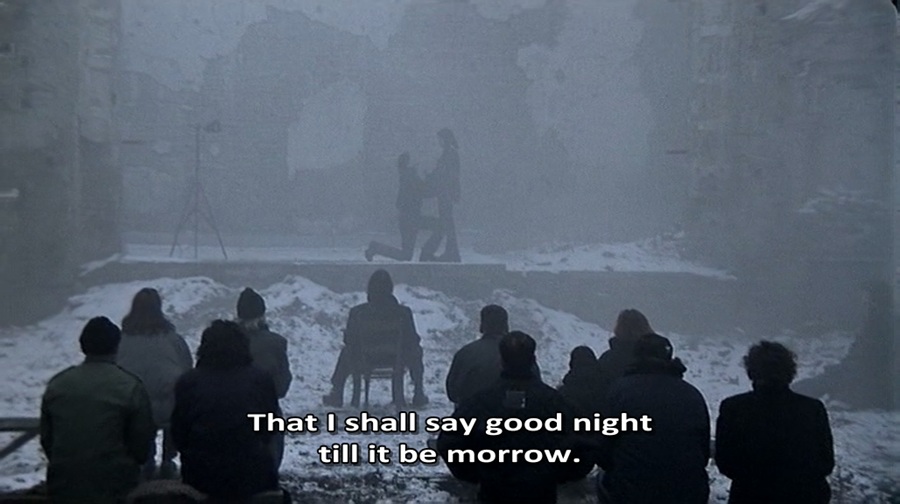 ทีแรกผมนึกว่าการแสดงชุดนี้น่าจะเกี่ยวกับ Ulysses แต่พอลองค้นประโยคคำพูด “Good night, good night! parting is such sweet sorrow, That I shall say good night till it be morrow.” กลับพบเจอว่ามาจากบทละคอน Romeo and Juliet ของ William Shakespeare ซึ่งสิ่งที่หนังน่าจะต้องการสื่อถึงคือการบอกใบ้ “Death Flag” เพราะนี่ช่วงเวลาโรแมนติกสั้นๆระหว่าง Romeo & Juliet ก่อนนำสู่โศกนาฎกรรม