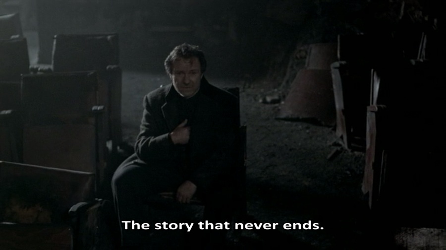 ตอนจบของหนังคือสิ่งที่ผกก. Angelopoulos อารัมบทไว้สำหรับภาพยนตร์ปิดไตรภาค Eternity and a Day (1998) ขอบเขตสุดท้ายคือชีวิต-ความตาย (Border of Life and Death) เหมารวมถึงวงการภาพยนตร์ ฉายฟุตเทจภาพแรกในโรงหนังที่มอดไหม้วอดวาย และจบคำกล่าวด้วยเรื่องราวไม่จบสิ้น (The story that never ends…)