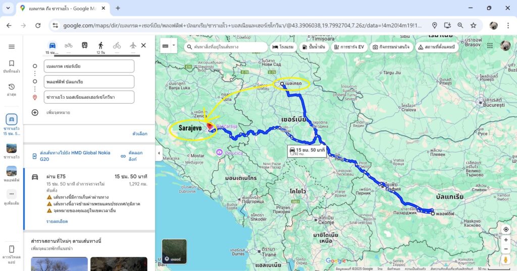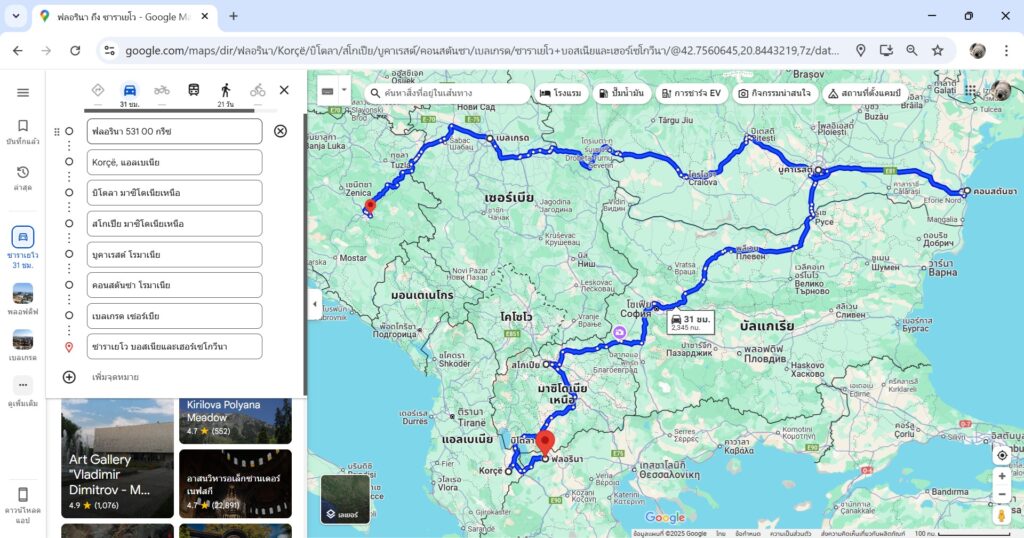 ปล. ผมลองทำแผนที่การเดินทางทัวร์คาบสมุทรบอลข่านของผกก. A เริ่มจาก Florina, Greece ไปจนถึง Sarajevo, Bosnia and Herzegovina แต่ได้ตัดข้าม Plovdiv, Bulgaria เพราะมองเป็นฉากความฝัน (ถ้าใส่เข้ามาเส้นทางมันเละเทะเลยละ)
