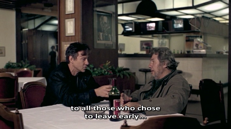 บรรดารายชื่อที่ผกก. A และ Nikos ต้องการดื่มอุทิศให้ น่าจะคือคนรู้จักของผกก. Angelopoulos ที่จากไปก่อนวัยอันควร คาดเดาไม่ออกเลยว่าพวกเขาเหล่านี้คือใคร