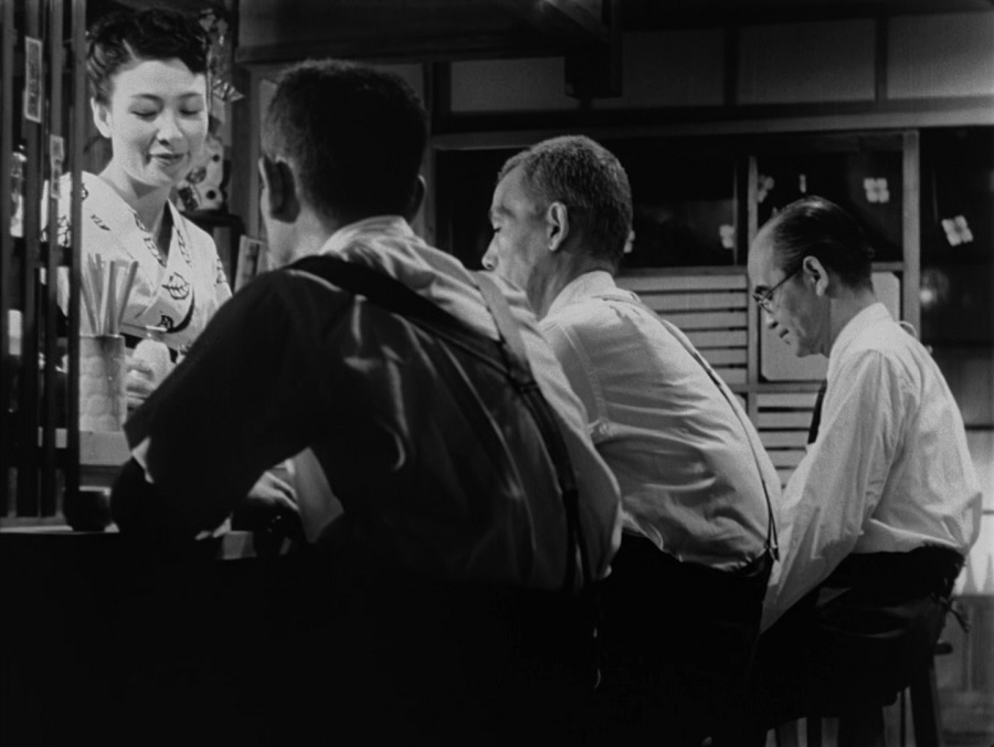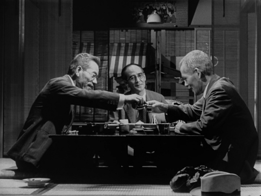 Shūkichi นัดพบเจอเพื่อนเก่า แต่การสนทนาของพวกเขาไม่ใช่ ‘สไตล์ Ozu’ แต่ก็ไม่ใช่ลักษณะ Overhead Shot เพราะถ่ายติดแขนด้านข้าง และมองลึกเข้าไป
