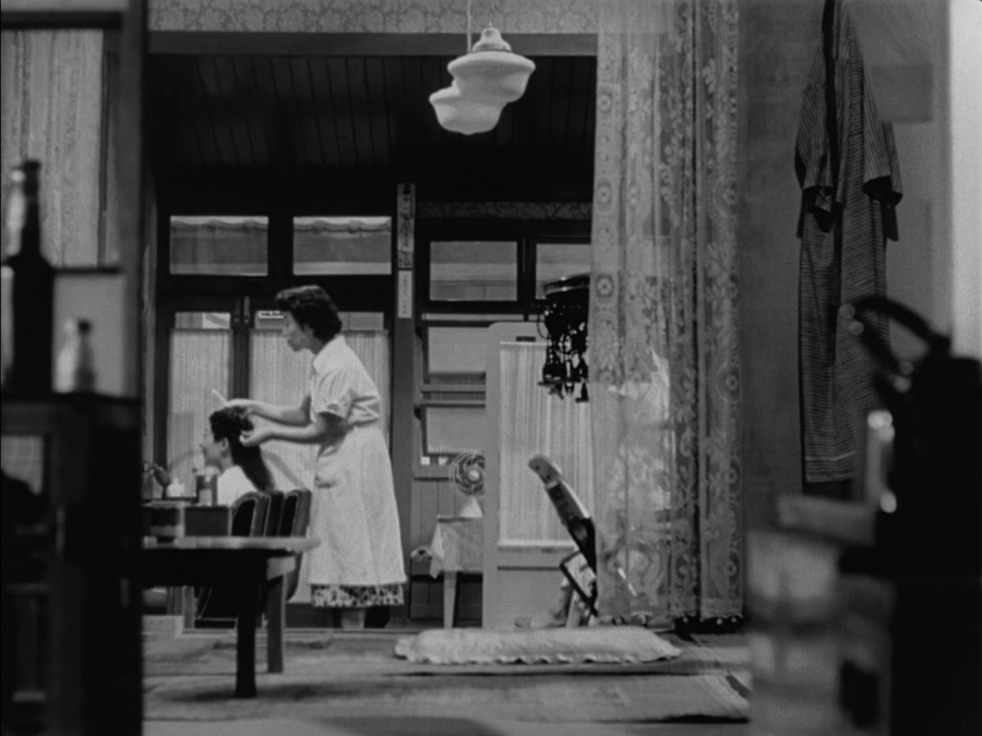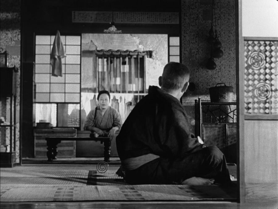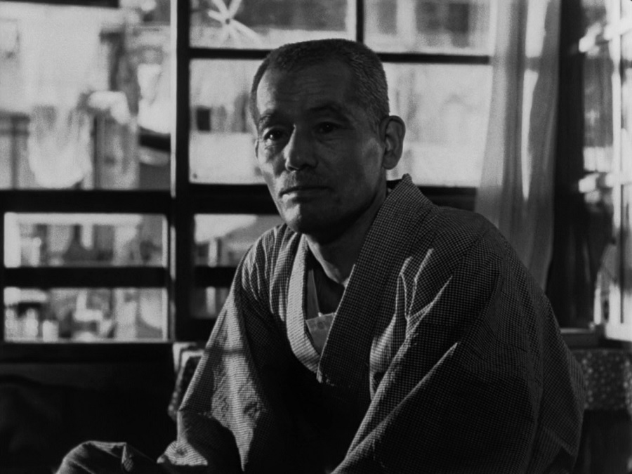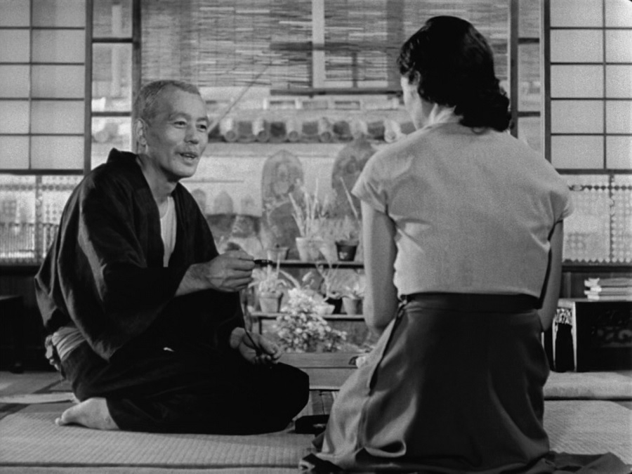 เพราะไม่รู้จะไปอาศัยหลับนอนแห่งหนไหน ในสภาพเมามายขาดสติเลยถูกตำรวจพาตัวกลับมาส่งยังบ้านของ Shige ทรุดนั่งลงตรงเก้าอี้ทำผม เงามืดอาบปกคลุมใบหน้า เป็นการสะท้อนสภาพจิตใจที่เต็มไปด้วยความผิดหวังต่อลูกๆ … ผู้กำกับ Ozu นำเสนอฉากนี้ราวกับว่า ถึงจะเมาปลิ้นสิ้นสภาพเพียงไหน แต่พ่อยังได้ยินทุกสิ่งอย่างที่ลูกสาวพูดพาดพิงถึงตนเอง