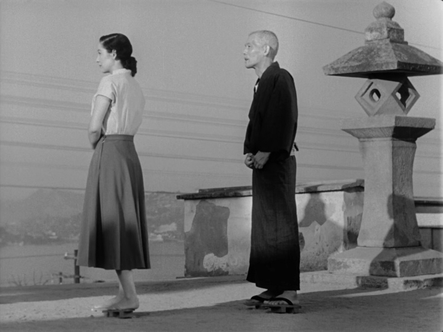 Noriko เดินออกไปตามพ่อที่กำลังยืนเหม่อจับจ้องมองท้องฟ้ามหาสมุทร จิตใจของเขาตอนนี้คงล่องลอยไม่อยู่กับเนื้อกับตัว มุมกล้อง 45 องศา ครุ่นคิดทำอะไรไม่ถูกเหมือนกัน ใครว่าอะไรก็ตามนั้น ยังมิอาจทำใจยินยอมรับการจากไปของภรรยาสุดที่รัก