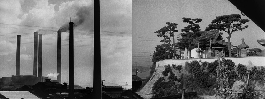 พบเห็นบ่อยครั้งกับภาพโรงงานอุตสาหกรรม ปล่องควันสูงใหญ่ สะท้อนการเข้ามาถึงของโลกยุคสมัยทุนนิยม ซึ่งผมนำอีกช็อตหนึ่งเข้ามาเปรียบเทียบ บ้านของครอบครัว Hirayama ไม่ใช่หลังที่อยู่ด้านบนนะครับ พบเห็นแค่หลังคา ปล่อยควันเล็กๆโพยพุ่งเข้ามา (หมายถึง ระบบทุนนิยมไม่ได้เข้ามามีผลกระทบแค่ระบบเศรษฐกิจเท่านั้น แต่ยังวิถีชีวิตประจำวัน ทุกสิ่งอย่างรอบข้างกาย ล้วนกำลังถูกครอบงำ กลืนกินโดยไม่รู้ตัว)