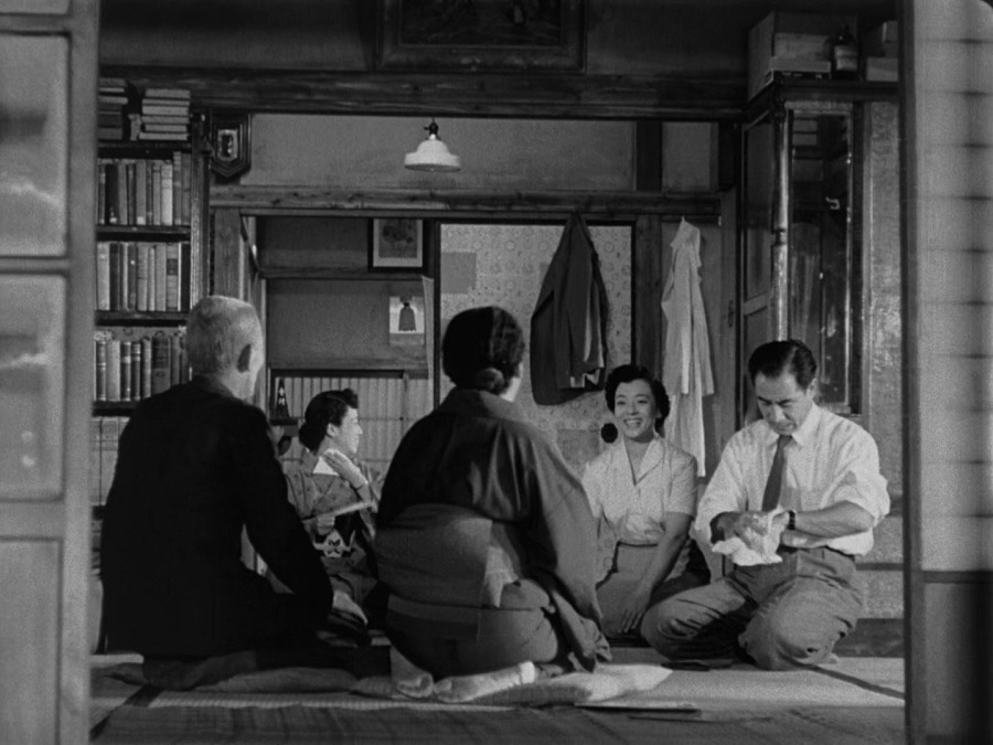 ช็อตที่ได้รับการยกย่องกล่าวขวัญถึงมากสุดของหนัง อีกหนึ่งลายเซ็นต์ ‘สไตล์ Ozu’ พบเห็นสมาชิกในครอบครัว นั่งไล่เรียงลำดับตามความสำคัญ